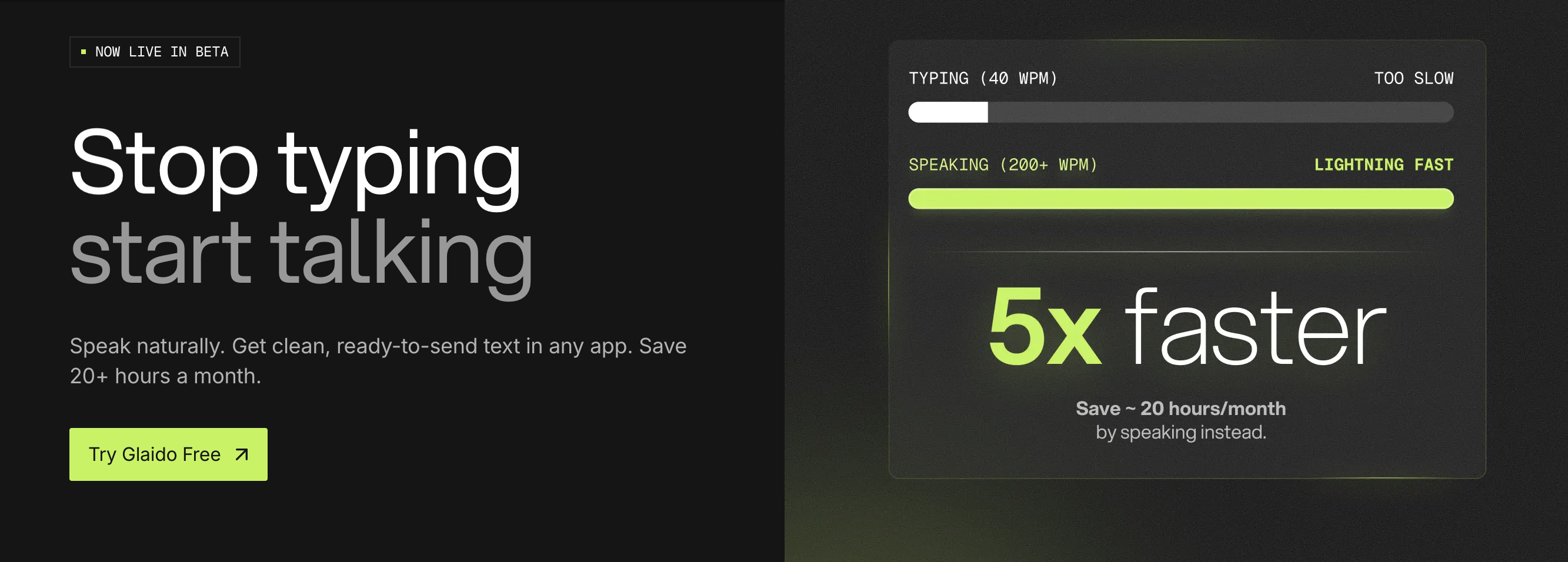 Application de transcription vocale propulsée par l'IA. Dictez vos notes, emails et documents et laissez Glaido les transcrire automatiquement.